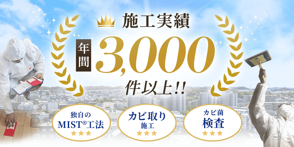 長引くカビの臭いや壁・床に広がる黒いカビ汚れに悩んでいませんか?市販の薬剤では、一時的な漂白に留まり、カビ菌の根絶や再発防止は困難です。カビバスターズは、年間施工実績3,000件を超えるカビ取り・カビ対策の専門家集団。私たちは、建物や素材を傷つけない独自開発のMIST工法®を用いて、木材やコンクリートの奥深くのカビまで徹底的に除去・抗菌します。特に高気密住宅や浴室、押入れなど、湿気がこもりやすい箇所のカビは、放置すると健康被害にもつながりかねません。現地調査とカビ菌検査で原因を特定し、お客様に最適なカビ対策をご提案。「これってカビ?」「施工費用はどれぐらい?」など、どんな些細なことでも構いません。まずは無料相談をご利用ください!