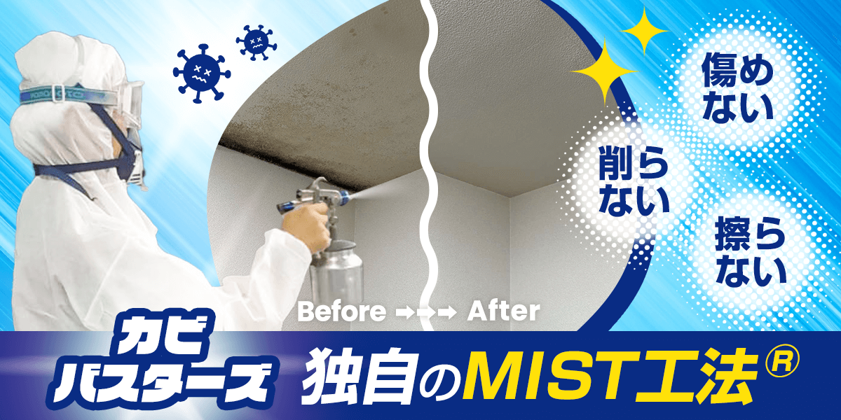 従来のカビ取りは、高濃度の塩素系薬剤でカビを漂白させたり、カビが生えている素材をブラシで擦ったり、削ったりする手法が一般的でした。この手法は、建物や素材を傷つけるだけでなく、カビの菌糸を内部に残してしまうため、再発のリスクがありました。カビバスターズは、そんな従来のカビ取り方法を覆す、素材を削らない・擦らない・傷つけない独自開発のMIST工法®を使用。確実にカビを除去するだけでなく、今後再発しないための、カビ対策も施すカビ取り業者のプロです。