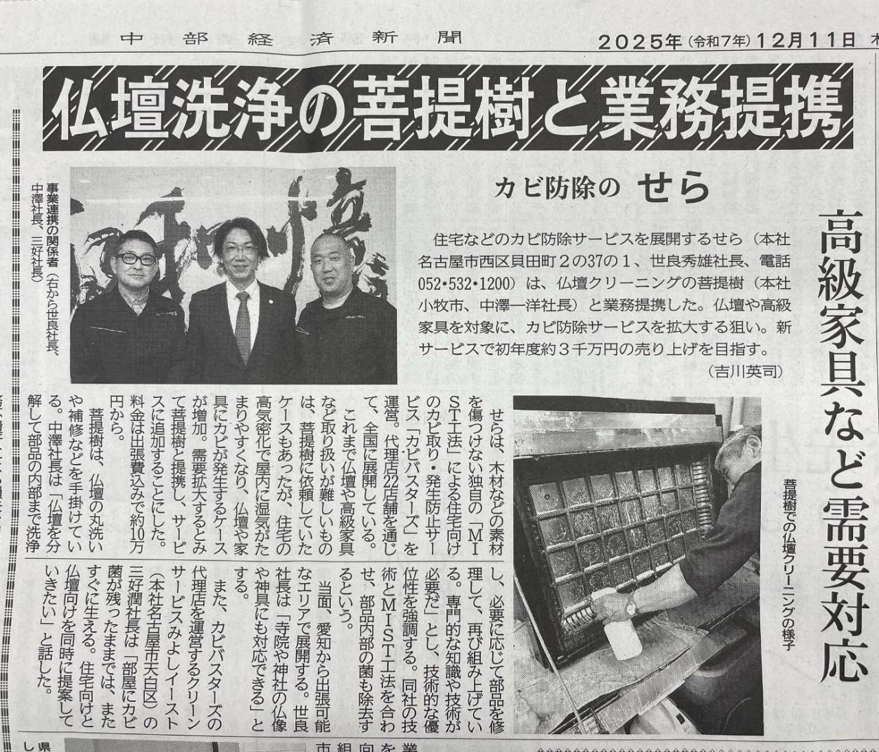中部経済新聞にカビ取り業者「カビバスターズ」と菩提樹が提携
