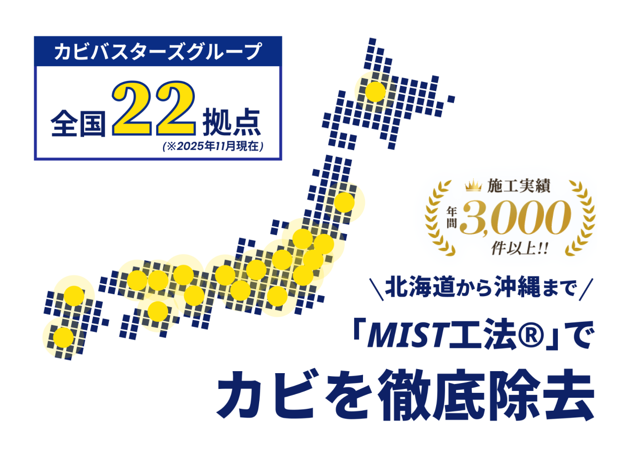 カビバスターズは全国対応!東海エリアをはじめ関西・関東・九州・沖縄でも多数の実績があり、各拠点から最短で駆けつけ、住宅や施設のカビ取り・防カビ対策を実施。全国どこでも高品質なカビ除去を実現します。