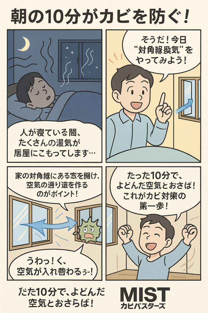 ・乾燥と換気:カビの発生を防ぐために、カビが発生した箇所をしっかりと乾燥させます。また、換気を行い、新鮮な空気を取り入れます。