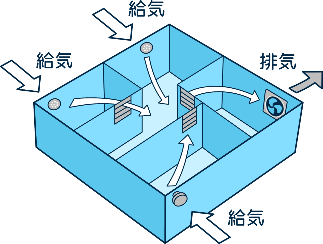 給気・排気を機械制御する最大のメリットは、住宅の内部に取り込む空気や排出する空気の量を常に一定に保てる点です。自然換気では、天候や建物の構造、そして風向きや気圧などさまざまな要因によって換気量が変動しやすく、十分に空気の入れ替えが行われない場合があります。また、高気密住宅では隙間が少ないため、窓を開けない限り空気がほとんど入れ替わらず、室内の湿度が上がりやすいというデメリットが生じることも少なくありません。
