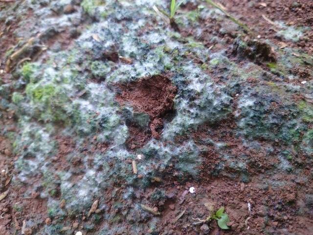 土の表面に出る白や灰色の毛状のカビ