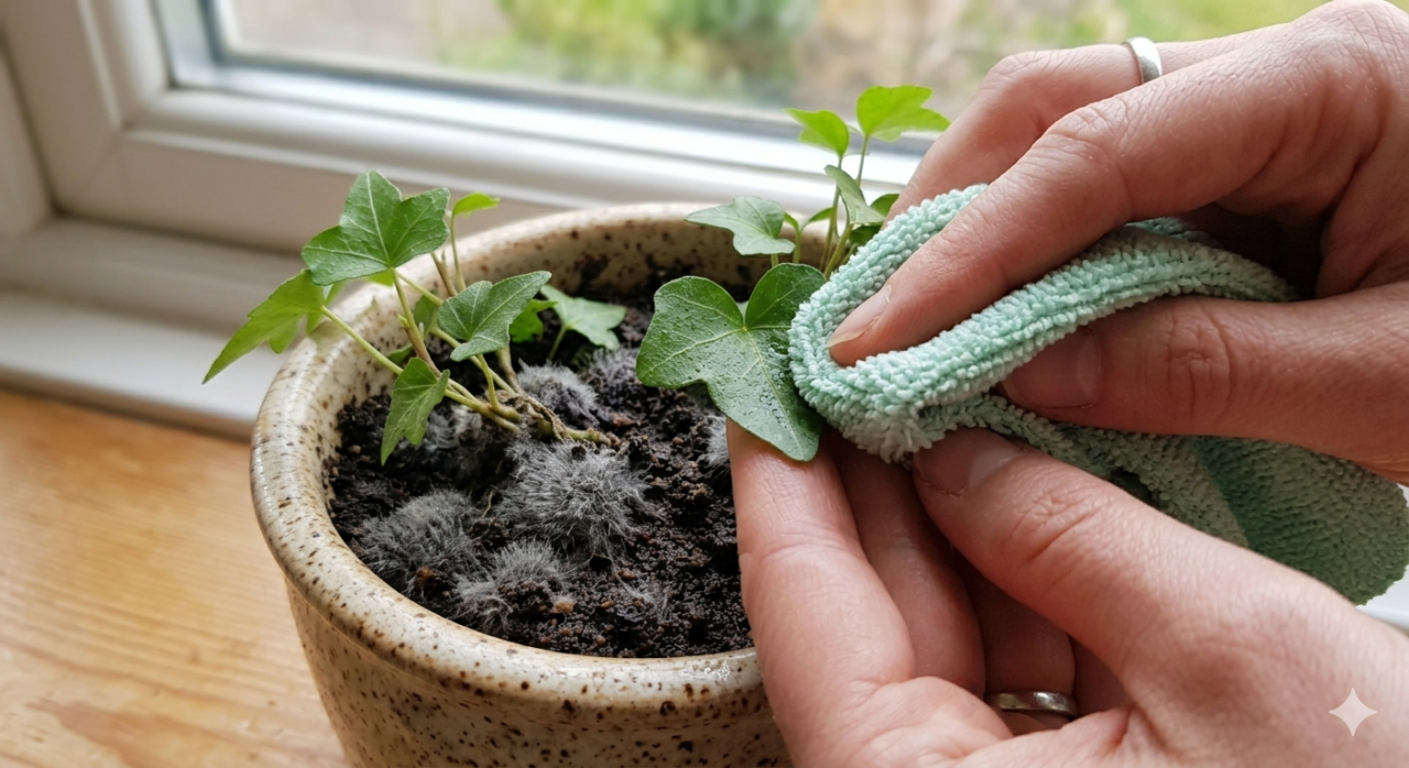 カビを発見したとき、まず取り組みやすい対処法がハンドシャベルや手袋を使った表面カビの取り除きです。土の上にうっすらと白い綿のようなカビが見られる程度であれば、そこだけを慎重に削り取るだけでも大きな効果が期待できます。削り取った土は、念のため屋外やゴミ袋などに入れて密封処理しておきましょう。カビの胞子が舞わないよう、取り除く際には極力ゆっくりと作業し、飛散を防ぐことが大切です。取り除いたあとの土は、表面を軽くかき混ぜるように耕して通気性を高め、できれば日当たりや風通しの良い場所に鉢を移動させると、カビが再び広がりにくくなります。