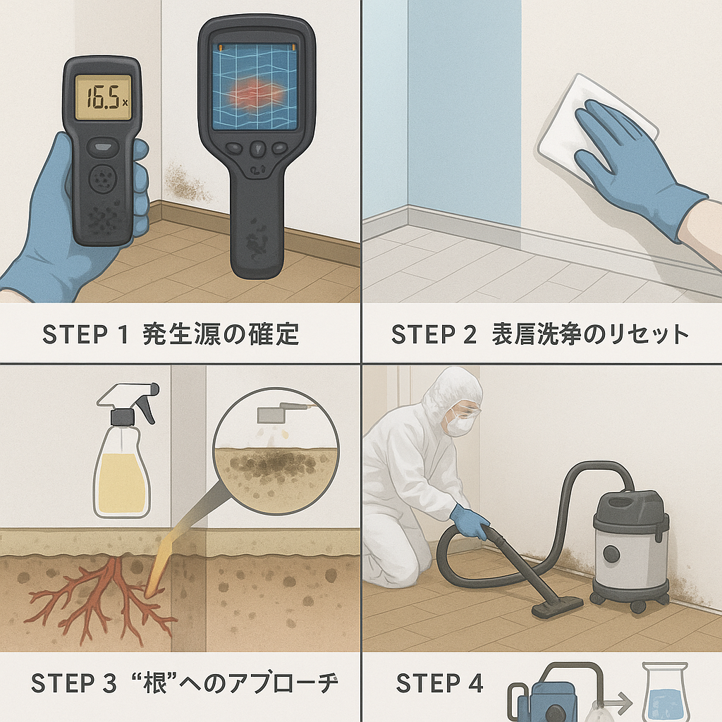 カビを「根から断つ」――言葉では簡単でも、そのプロセスを頭の中で正確に思い描くのは意外と難しいものです。そこで本章では、専門知識がなくても直感的に理解できるよう、可視化イラストと現場撮影写真を組み合わせた独自のビジュアル資料を用意しました。順を追ってご覧いただくと、除去作業がどのような手順で進み、どの段階で“根”にアプローチしているのかが一目瞭然。動画セクションと連動させることで、静止画だけでは伝えきれない立体感やスピード感も体験していただけます。