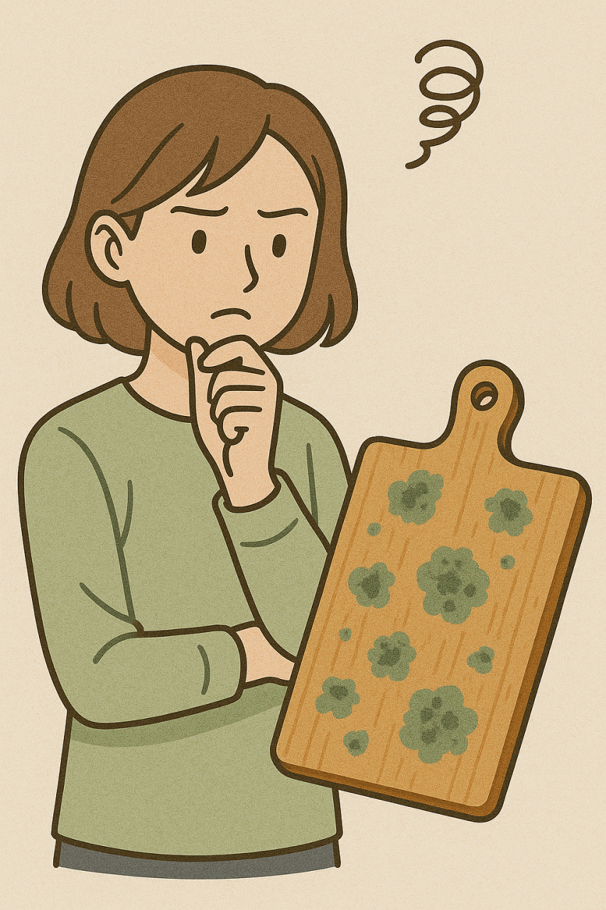 包丁で付いた細かな切り傷は、カビが躍り込むVIPルーム。そこへ肉や魚のタンパク質、野菜の糖質が入り込み、酸素も潤沢──黒カビにとっては三ツ星ビュッフェです。定期的に表面をサンドペーパーで軽く研磨し、溝に潜む汚れをそぎ落とすメンテナンスが効果大。🔪