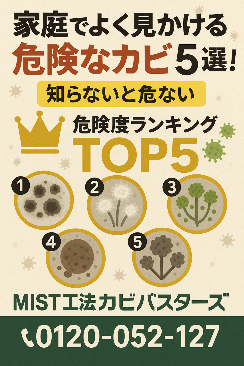 今回のブログでは、私たちの生活空間でよく目にするカビを「危険度ランキング形式」でご紹介します。カビの正体を知ることで、適切な対処や予防ができ、家族の健康を守ることができます。もしこの記事を読んで「うちのカビ、危険かも…」と感じたら、早めの対策が大切です。全国のMIST工法®カビバスターズが、あなたの暮らしを守るためにお手伝いします。