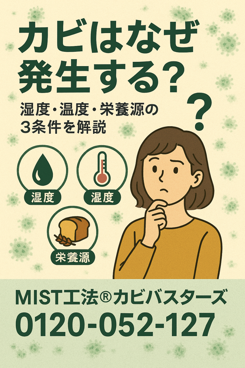 本記事では、湿度・温度・栄養源がカビにどう影響するのか、そして私たちが日常生活でできる対策のヒントを、わかりやすく解説します。もし今、すでにカビが気になる場所がある場合は、放置せずに早めの対応が大切です。深刻な被害になる前に、全国のMIST工法®カビバスターズへお気軽にご相談ください。きっと安心できる解決策が見つかります✨