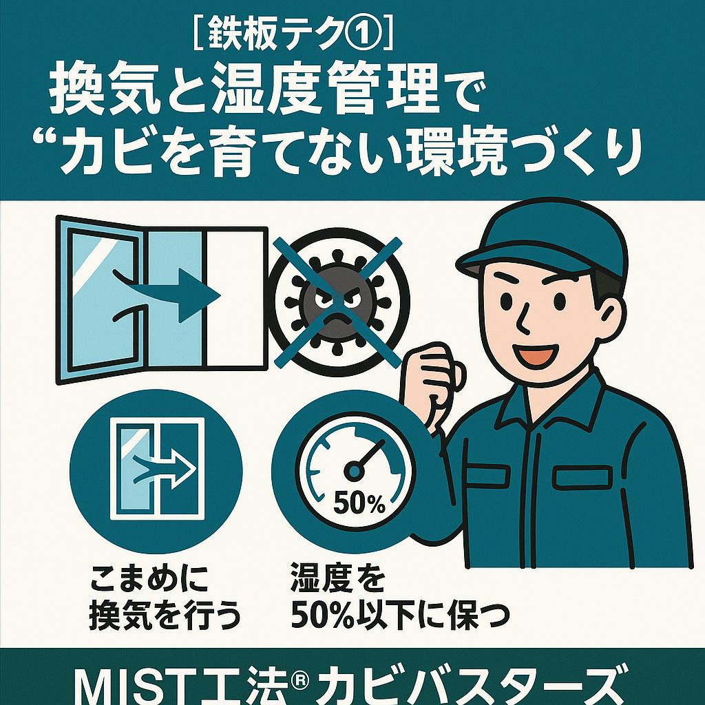 また、塩素系漂白剤と酸性洗剤(酢・クエン酸等)を絶対に混ぜない、作業時は換気・手袋・マスク・ゴーグルを徹底するなど安全面も最優先に。3条件を理解して**「湿度を上げない・栄養を残さない・風を通す」**習慣に変えることが、カビ取りの効果を最大化し、再発をぐっと遠ざけます。広範囲で増えている、においが強い、体調に不安がある――そんな時は無理をせず、MIST工法®カビバスターズ本部へ早めにご相談ください💬