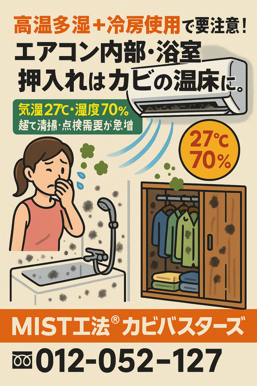 高温多湿+冷房使用で要注意!エアコン内部・浴室・押入れはカビの温床に。気温27℃湿度70%超で清掃・点検需要が急増