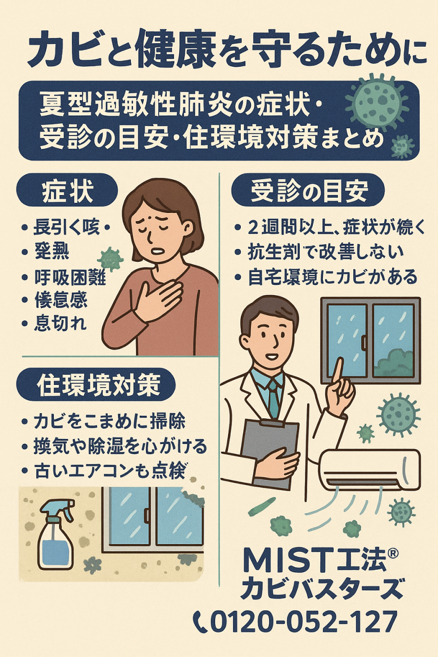 このブログでは、カビが健康に及ぼす影響や夏型過敏性肺炎の特徴的な症状、受診の目安、そして住環境でできる対策についてわかりやすく整理しました。もし「もしかして自分や家族も…?」と感じたら、早めに専門機関へ相談することが安心への第一歩です。そして、カビの問題で困った時には、MIST工法®カビバスターズ本部にお気軽にご相談ください。あなたとご家族の健康、そして快適な暮らしを守るために役立つ情報をお届けします🌿
