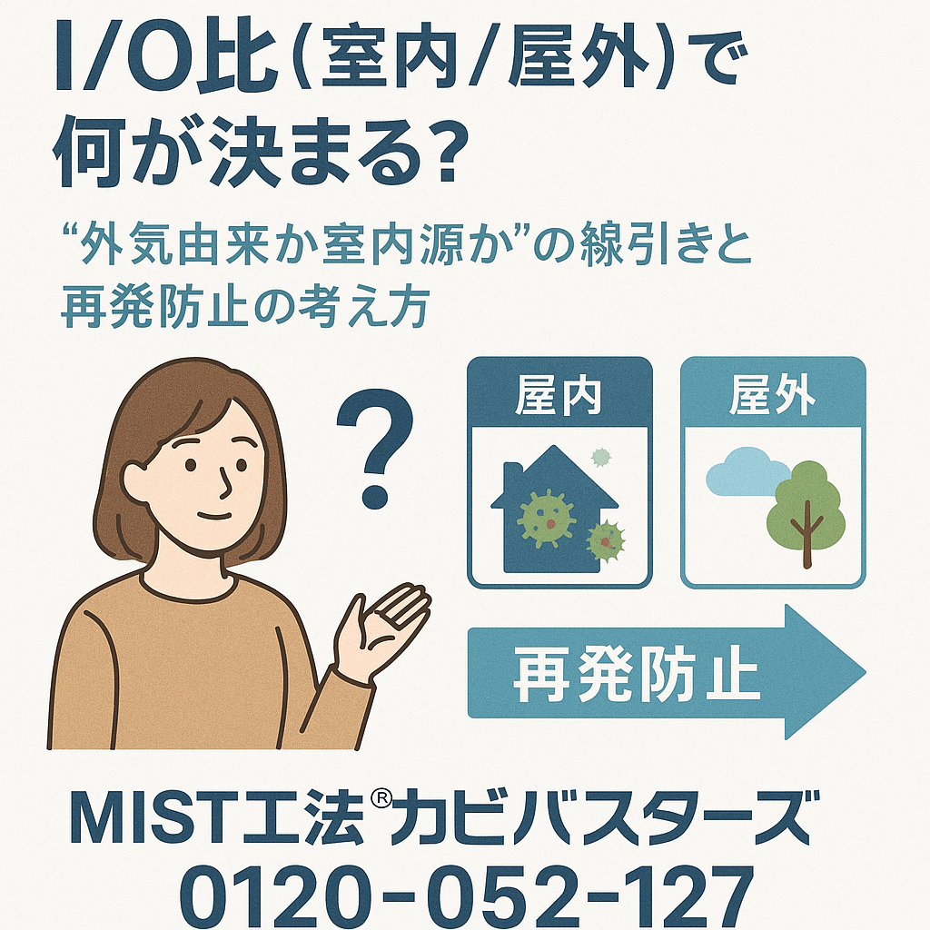 こんにちは。MIST工法®カビバスターズ本部です。カビ臭やくしゃみ・目のかゆみ、壁や天井の点状汚れなど、「原因が室内にあるのか、それとも外から入ってきているのか」が分からず対策が進まない——そんなご相談を多くいただきます。そこで役立つのが I/O比(室内/屋外) という指標です。I/O比は、同じタイミングで採取した「室内の空気中真菌の濃度」を「屋外の濃度」で割った値(I/O=Indoor/Outdoor)。この数値の“傾き”を読むことで、カビが 外気由来 なのか 室内源 なのかの線引きがしやすくなります📈