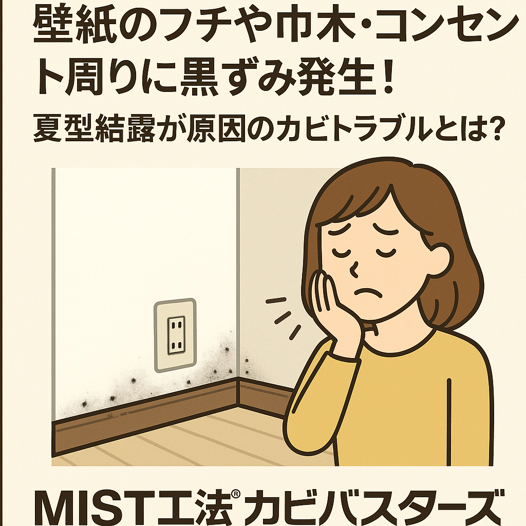 壁紙のフチや巾木、コンセント周りに現れる黒ずみ。それをきっかけに「もしかしてカビ?」と不安になる方は少なくありません。小さな黒ずみであっても、その背後には“夏型結露”による内部結露が進行している場合があり、放置すれば健康被害や建材の劣化につながるリスクがあります。