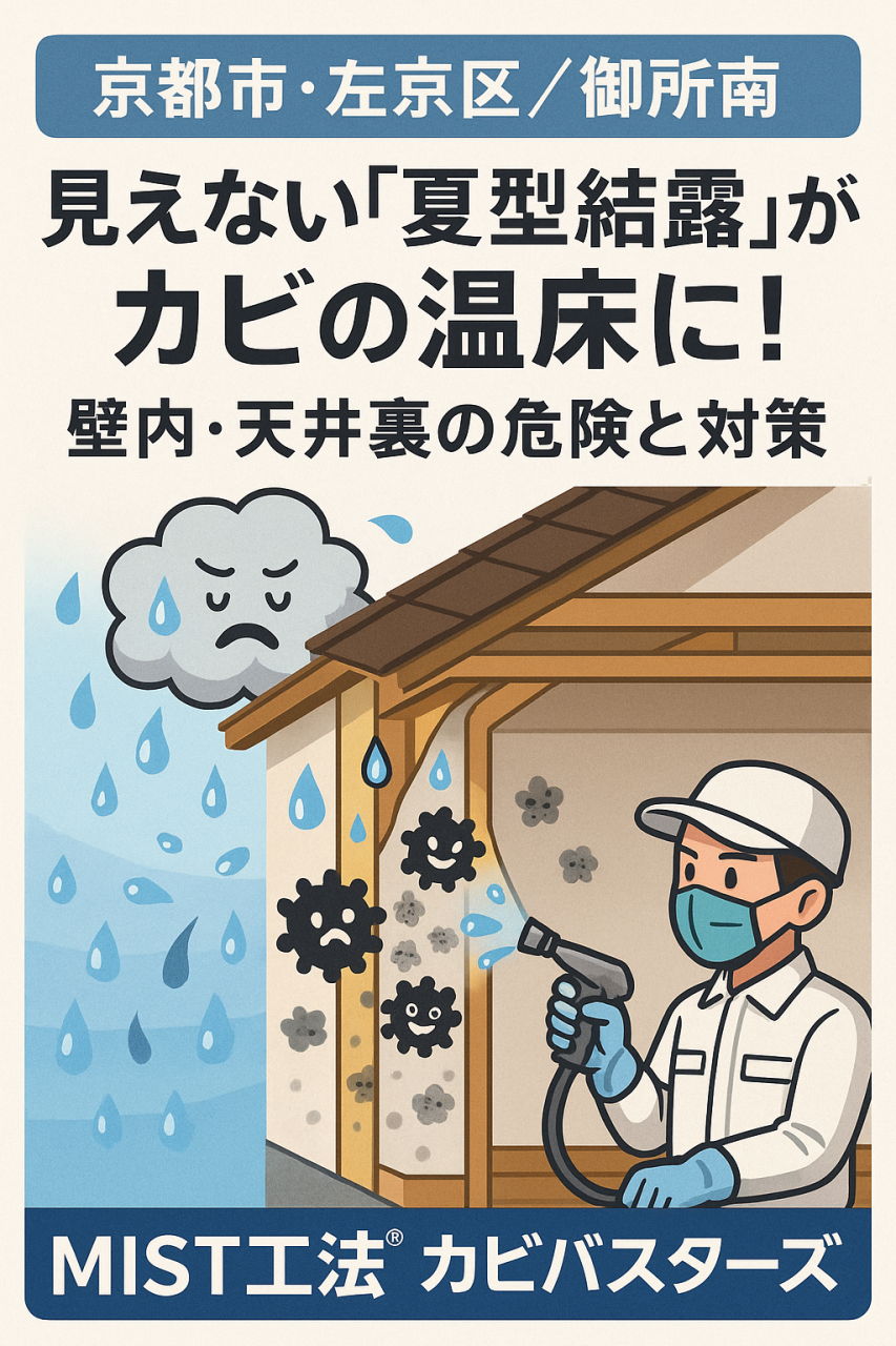 京都市(左京区・下鴨・御所西/御所南など)では、毎年夏になると「なぜか家の中がカビ臭い…」というご相談を多くいただきます。実はこの時期に増えるのが、“夏型結露” による壁内や天井裏のカビなんです。😱