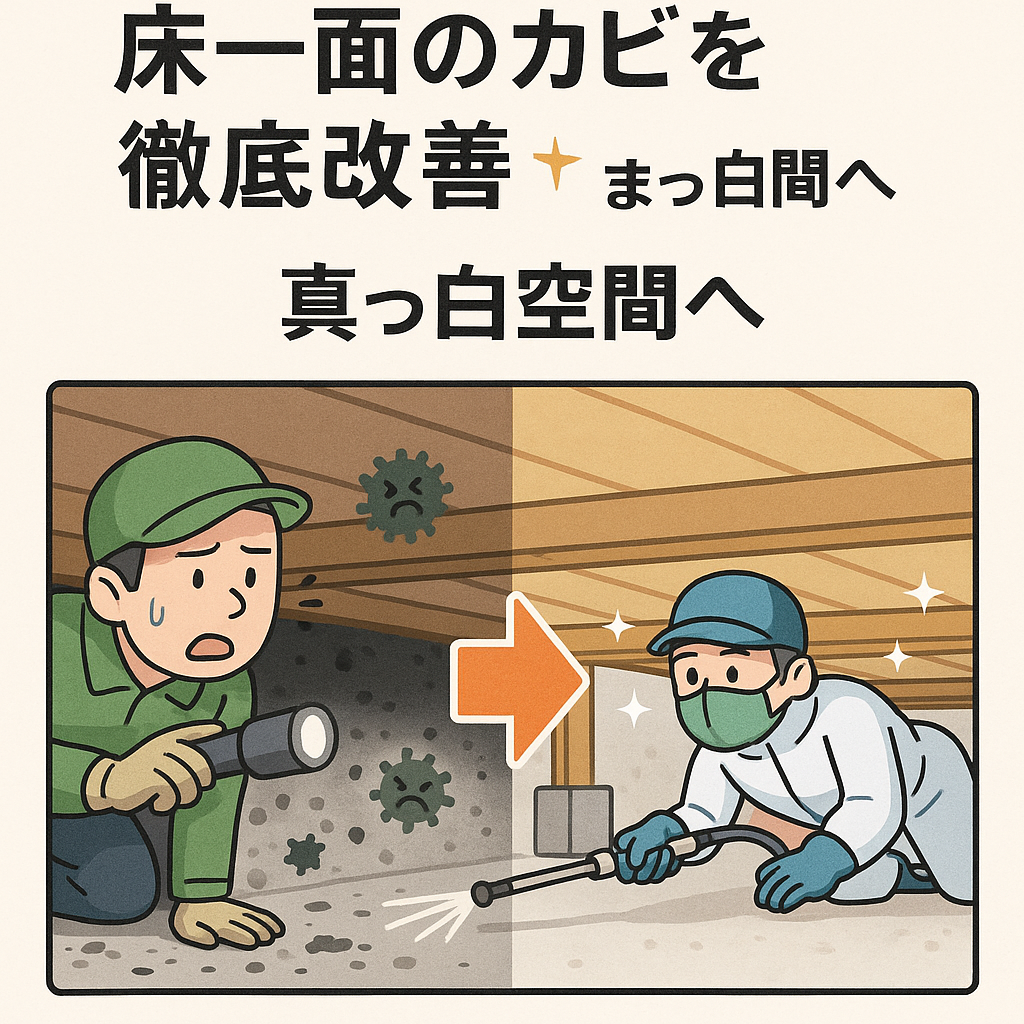 今回は、シロアリ業者さんの点検中に“床一面のカビ”が発見されたケースについてお話しします。実は、北海道、宮城県、東京都、神奈川県、愛知県、大阪府、広島県、福岡県など、日本全国で「シロアリの点検をきっかけにカビが見つかった」というご相談が増えているんです💦