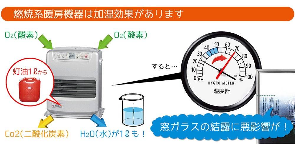 さらに問題なのが、石油やガスなどの燃焼式暖房器具は燃焼時に“水蒸気”を発生するという点です。
